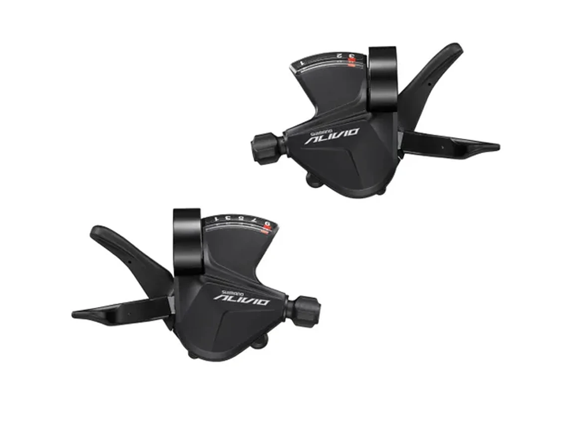 The Shimano Alivio SL-M3100 shift lever set provides responsive rear shifting for 3×9-speed mountain bike drivetrains.Â