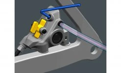 Easy Maintenance – To simplify maintenance, the hydraulic 2-piston brake caliper not only features the proven One-Way-Bleeding system, but also a separate arrangement of bleed nipple and opening screw. On the one hand, this minimises the risk of the bleed kit hose slipping off when opening or closing the system and, on the other hand, makes it unnecessary to dismantle the caliper from the frame for bleeding process.